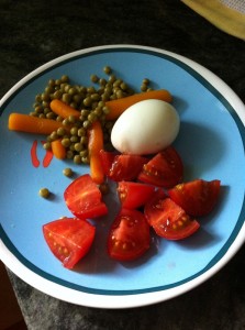 Non là j’déconne. C’est pas vrai. J’ai juste ouvert une boite de petits pois carottes (allez le p’tit mange des carottes c’est bon pour le moral, les cuisses roses la bonne humeur, ça rend aimable parait-il et ça te ferait pas de mal) et puis un oeuf dur (va te faire cuire un oeuf toussa…), mais admirez un peu la présentation de folie (et la belle assiette, merci Monop’)