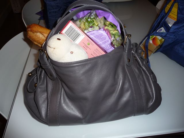 – en parlant de sac, voici le mien toujours, mon Darel à moi que j’aime d’amour et qui m’a coûté un rein, hier soir en rentrant du boulot (oui j’ai fait les courses au passage, c’était le soir, vu que j’avais déjà dû rentrer à pieds étant donné que mon bus était annoncé dans 17 minutes, autant marcher que d’attendre comme une cruche à l’arrêt !)… ça fait chic hein ? Oui il y a le doudou que ma fille m’a laissé le matin à l’école, du pain, de la salade, une pâte brisée pur beurre (oui madame) et une salade toute prête !